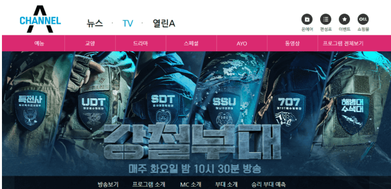 채널A는 밀리터리 서바이벌 생존 프로그램을 방송하고 있으며 관련 영상을보고 싶다면 채널A 홈페이지에서 시청해야 합니다. 강철부대 프로그램을 선택해서 프로그램 소개, MC 또는 부대 소개 및 여러 동영상을 볼 수 있습니다.
