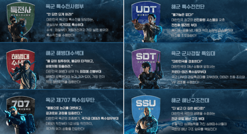 각 부대는 4 인으로 구성되어 있으며, 특전사에는 '한잔해'로 유명한 박군이 출연해 화제를 낳기도 했습니다. 도중 707에서는 박 중사가 사생활 논란으로 하차하며 모든 장면이 편집되기도 했습니다.
