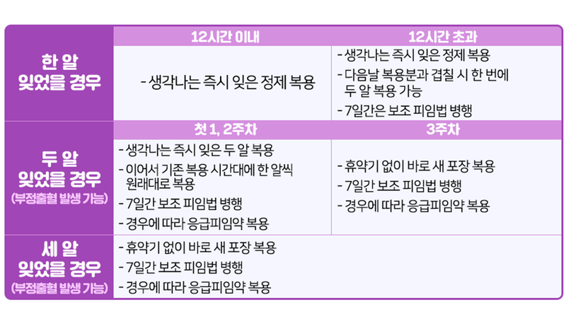 만약 하루 동안 시간 오차가 생겼을 경우에는 반드시 12시간 내에 복용해야 합니다. 중요한 점은 한두 번은 괜찮지만 여러 번 복용시간을 놓치거나 달라지면 피임 실패율이 올라갑니다.
