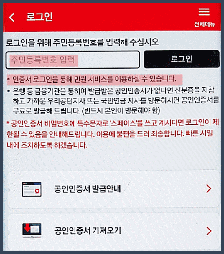 ▼ 주민등록번호 입력 -> 공인인증서를 통해 로그인
