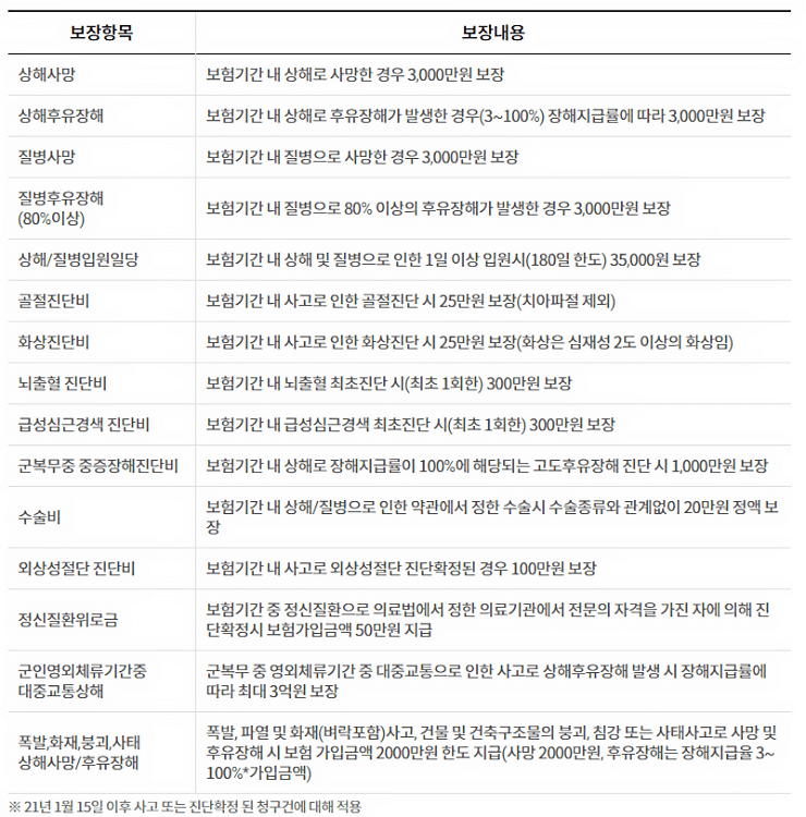 2021년 1월 15일부터 수술비를 20만원으로 상향 조정했고, 폭발, 화재 등으로 인해 사망 또는 후유장해 발생 시 최대 2천만원 추가 지급합니다. 자세한 보장 항목 및 보장 내용 그리고 접수 방법은 아래를 참고하세요.