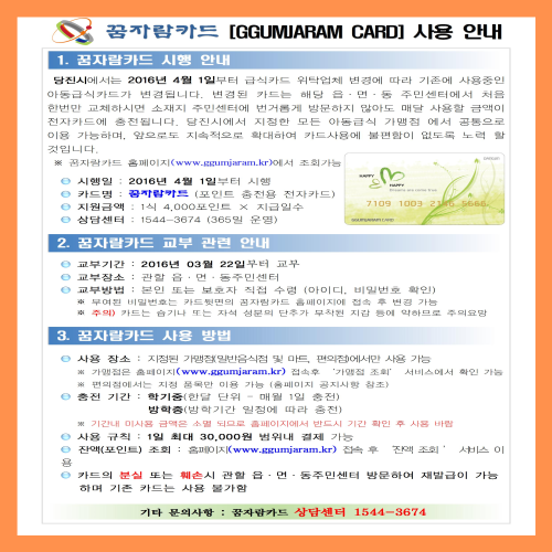 휴가기간에는 휴가일수만 충전해 휴가기간에 매일 사용할 수 있고, 주민센터 방문 없이 매달 1일에 자동으로 충전요금을 내면 전월(충전기간) 사용하지 않는 잔류점을 소멸시킨다. 꿈의 카드 분실이나 훼손 시 주소지인 읍면동 주민센터를 방문하면 재발급을 받을 수 있습니다. 카드를 재발급받으면 기존 카드는 재사용이 불가능합니다.