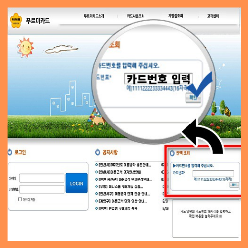푸르미카드 홈페이지에 접속하면 화면 오른쪽에 위치한 잔액조회 플랫폼란에 카드 앞면의 카드번호 16자리를 입력하고 확인 버튼을 누르면 꿈자람 카드에 남아있는 잔액이 표시됩니다. 꿈 깨우기 카드 사용에 대한 정보는 Furmi 카드 웹 사이트의 왼쪽에 위치한 프랜차이즈 조회 [additional Shop inquiry] 버튼을 누르고 확인 가능합니다.