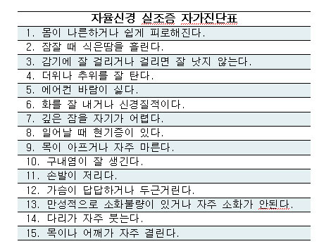 자율 신경 실조증은 신체에서 자율적으로 조절되어야 하는 신경이 능력을 상실하는 것을 의미합니다. 현대인들은 종종 과도한 업무로 불안감, 긴장감 그리고 스트레스에 노출되기 쉽습니다. 이를 잘못 관리하면 신경계와 부교감 신경계 사이에 불균형을 일으키기 쉽습니다.