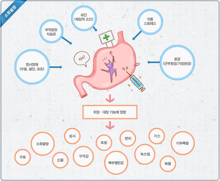 기능성 소화 불량은 비정상적인 위 운동, 위산 분비 증가, 헬리코박터 파일로리 감염, 축적된 피로, 스트레스 및 내장 감각 이상 등이 동반되어 발생합니다. 몸이 좋지 않거나 스트레스를 느낄 때 이 증상들은 더 악화될 수 있습니다.