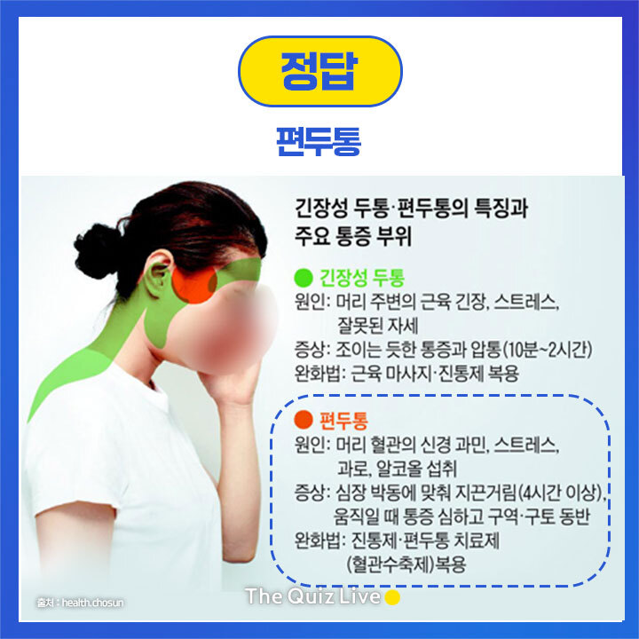 신경성, 근육 수축성 두통이라 불리는 긴장성 투통은 같은 자세로 장시간 작업하거나 심한 정신적 스트레스를 받을 때 더 자주 발생합니다.