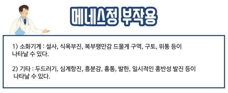 이상으로 메네스정에 대한 정보를 알려드렸습니다. 의약품 복용 전에는 반드시 주의사항, 부작용 등을 확인해야 합니다. 만약 이상 반응이 생기면 즉각 복용을 멈춰야 합니다. 감사합니다.