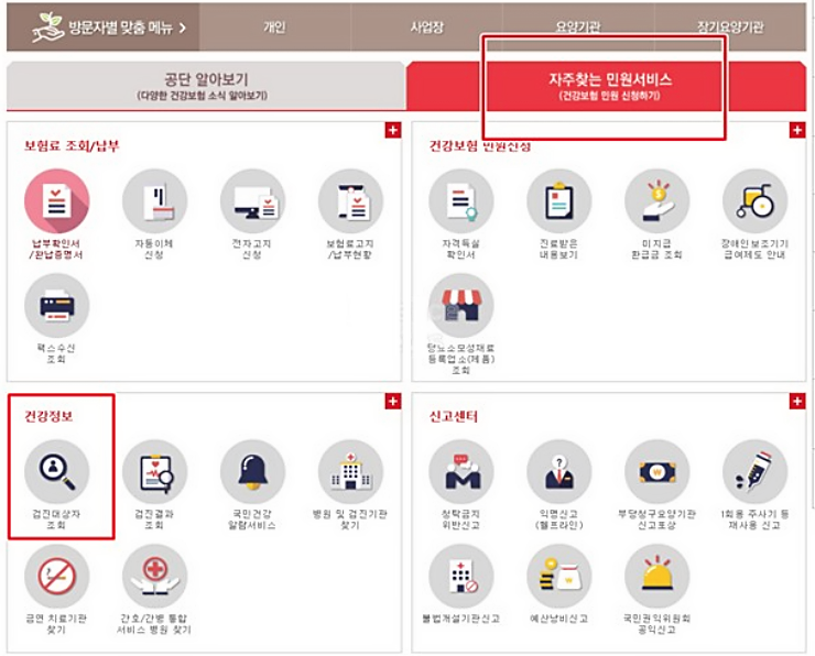 2. 자주찾는 민원서비스 > 건강정보 > 검진대상자 조회 클릭