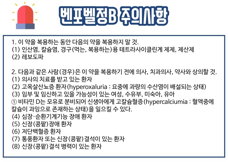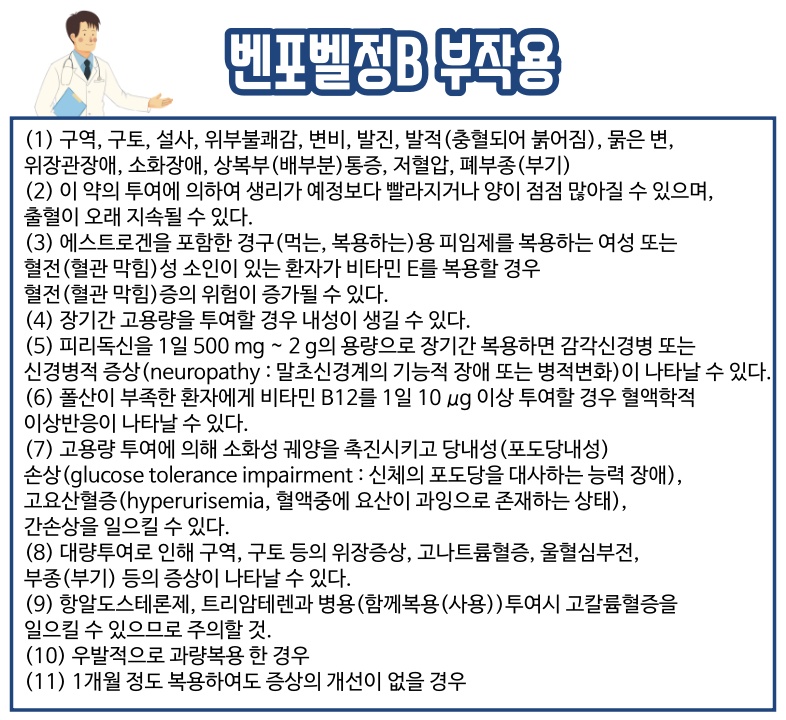 지금까지 벤포벨정B에 대한 효능 및 부작용 그리고 주의사항 등을 알아봤습니다. 큰 부작용은 없으나 복용 전 꼭 참고하시기 바랍니다. 복용 시 이상 증상이 나타나면 복용을 즉각 멈추고 의사나 약사와 상의하시기 바랍니다. 감사합니다.