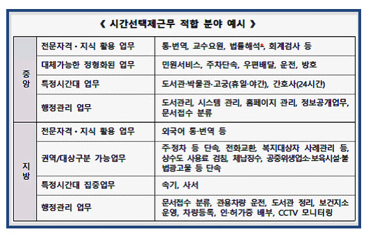 표를 보면 아시겠지만 근무 분야는 한정적입니다. 특정시간대에 업무가 몰리거나 전문 지식을 활용해야 하는 업무 그리고 탄력적으로 근무 시간을 조절해야 하는 곳에서 주로 시간제 공무원을 필요로 하고 있습니다.