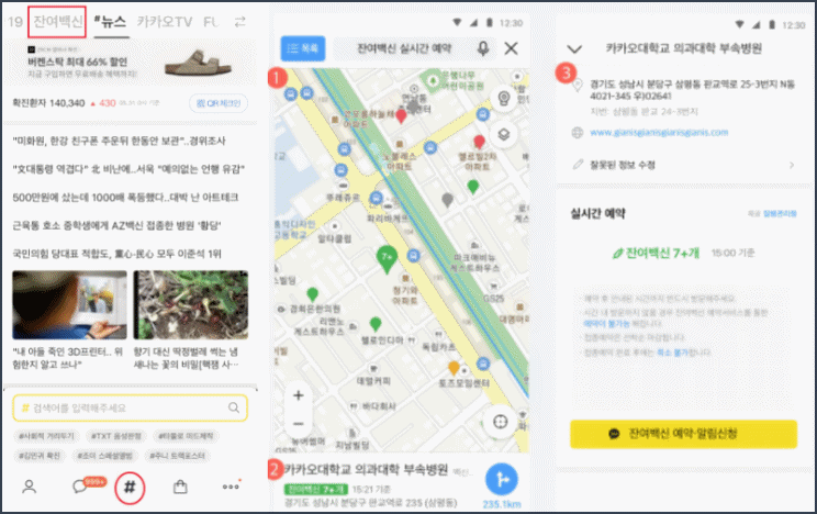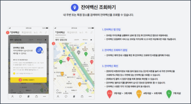 예약 방법은 크게 네이버와 카카오톡으로 예약이 가능합니다. 기본적으로 자신의 핸드폰에 해당 앱이 설치되어 있어야 하며 해당 앱을 통해 검색하게 되면 근처 백신 접종 기관의 위치와 잔여 수량 등을 확인할 수 있습니다.