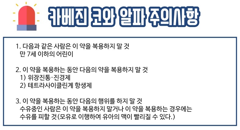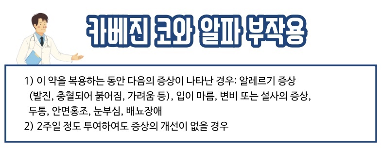 이상으로 카베진 코와 알파 의약품에 대한 정보를 살펴봤습니다. 복용 방법은 성인과 소아들과 다릅니다. 정해진 복용량을 지키지 바랍니다. 감사합니다.