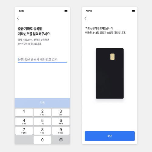 토스머니카드에 사용할 비밀번호를 입력합니다. 이 비밀번호는 ATM 인출 및 카드 정보 변경에 사용됩니다. 다음단계는 토스머니카드에 연결할 계정을 선택합니다. 결제 시 토스 머니 잔액이 부족한 경우 50,000 원 단위로 충전해 사용할 수 있습니다.