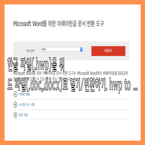 한글 파일을 단어로 변환할 때 별도의 프로그램을 설치하지 않고도 설정이 가능합니다. 파일을 다른 이름으로 저장할 때 파일 형식만 워드 문서 \"docx\"또는 \"doc\"(워드 문서 파일 확장자 :. doc /. docx, 한글 파일 확장자 :. hwp) 한글 파일을 워드 파일로 변환하기 위해 한컴 오피스 한글 프로그램을 실행한 후 변환할 파일을 호출합니다.