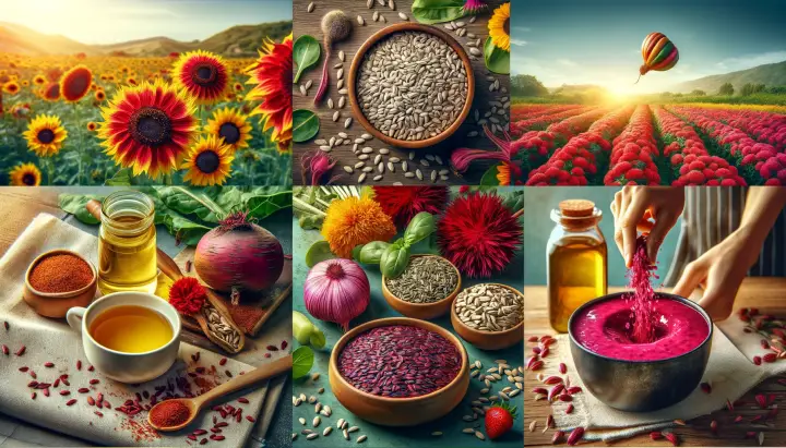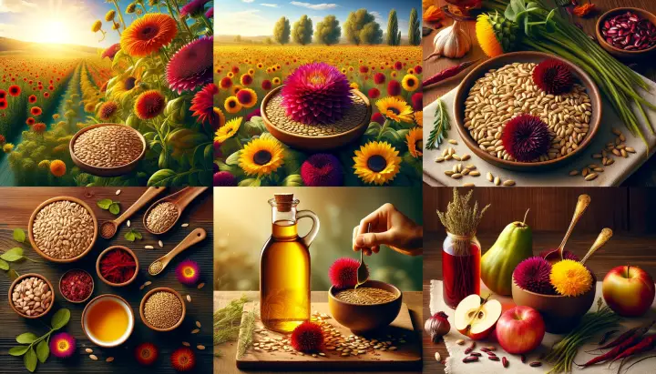2. **홍아씨 오일**: 홍아씨 오일을 식용, 미용, 건강 용도로 사용할 수 있습니다. 정제한 홍아씨유는 튀김용 기름으로도 좋습니다.